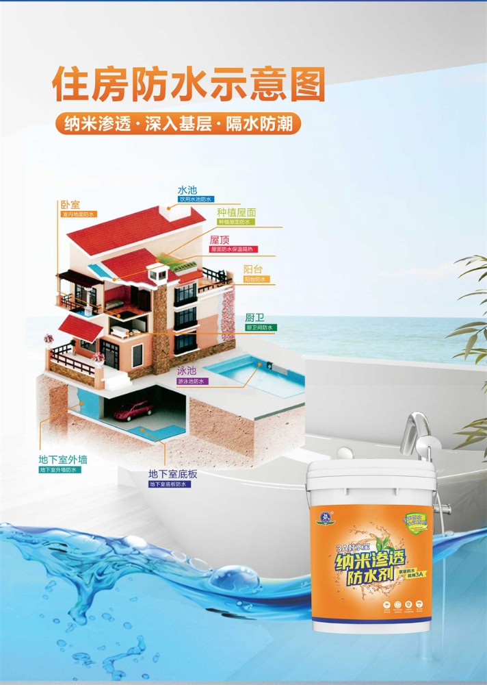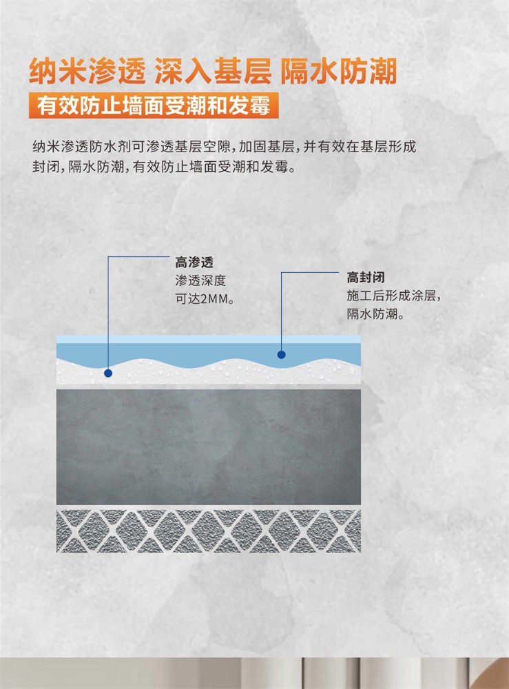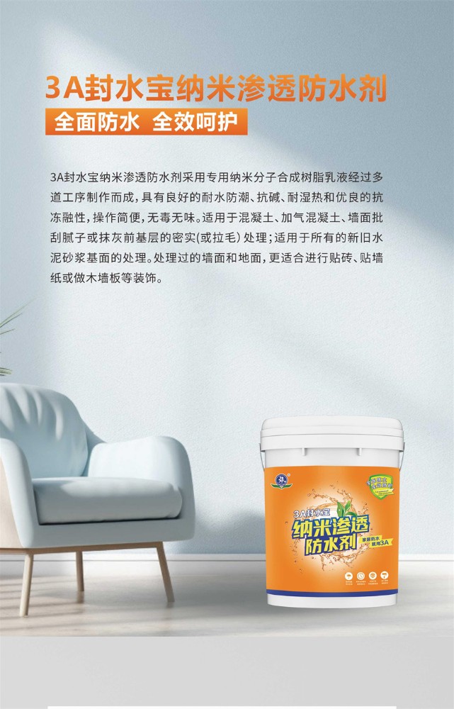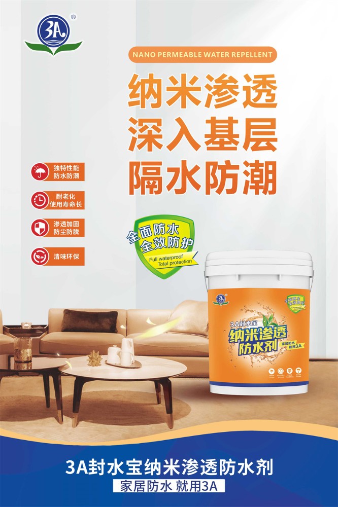 3A封水寶納米滲透防水劑采用專用納米分子合成樹脂乳液經(jīng)過多道工序制作而成,具有良好的耐水防潮、抗堿、耐濕熱和優(yōu)良的抗凍融性,操作簡便,無毒無味。適用于混凝土、加氣混凝土、墻面批刮膩子或抹灰前基層的密實(或拉毛)處理;適用于所有的新舊水泥砂漿基面的處理。處理過的墻面和地面,更適合進行貼磚、貼墻紙或做木墻板等裝飾。